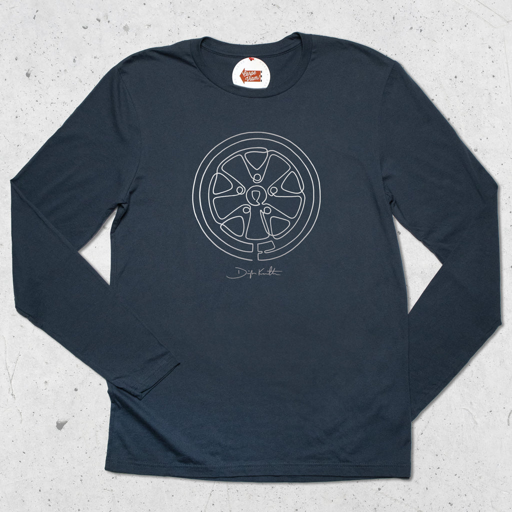 Captured in a single continuous line (after many attempts) this Fuchs Wheel design is the latest shirt in what I'm calling my "signature" line. Shirts that feature real art, and as such, bear the Dwight Knowlton signature on the front. They are printed in silver ink on a premium 100% combed cotton Indigo t-shirt.